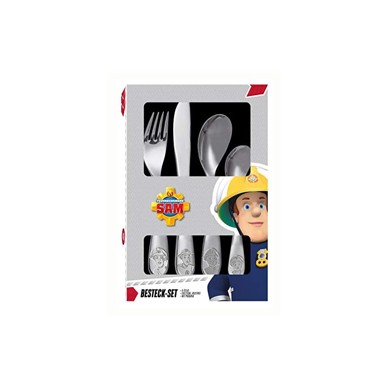 POS 27138 – Besteckset mit Feuerwehrmann Sam Prägung, 4 teiliges Kinderbesteck aus rostfreiem Edelstahl, spülmaschinengeeignet, bestehend aus Messer, Gabel, großer und kleiner Löffel