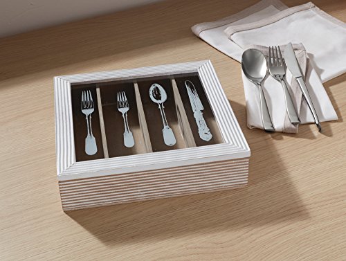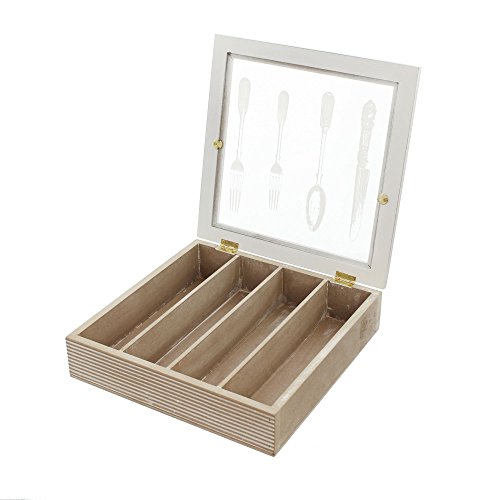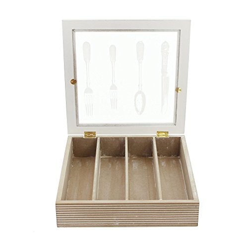 In rural nostalgischem Etikette, Kaukasisch gekalkte Holzbox mithilfe praktischer Facheinteilung, weißer Klappdeckel mithilfe Glaseinsatz darüber hinaus feinem Besteckaufdruck. Metrik: 24 x 24 x 6 cm.