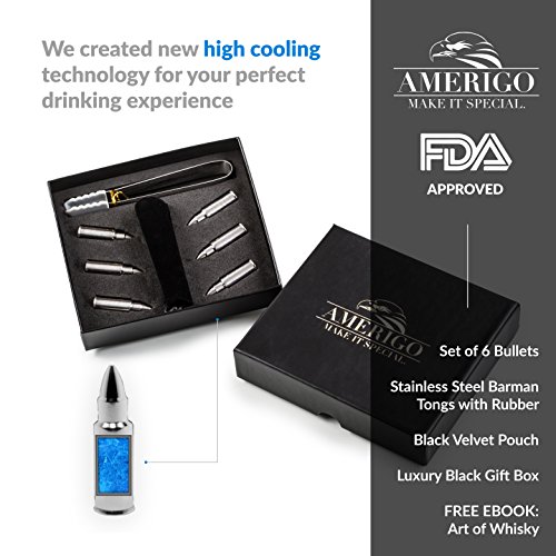 ✔️WHISKY STEINE PATRONENFORM GESCHENK-SET ENTHÄLT: 6 wiederverwendbare Patronenförmige Edelstahl-Eiswürfel + Aufbewahrungstasche + Barkeeper Zange mit Gummi-Ende für die beste Nutzung.