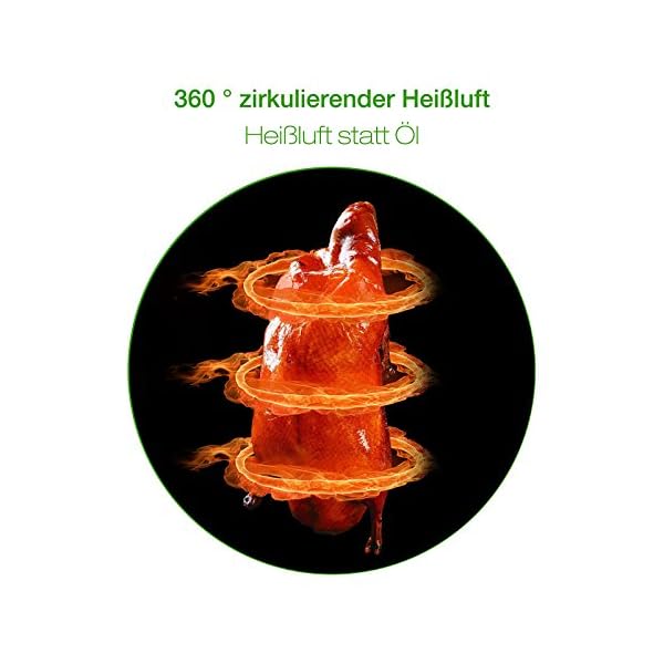 【Heißluftfritteuse mit der neuesten Technik】: Durch die einzigartige Kombination nicht mehr da zirkulierender Heißluft und der perfekten Temperatur ist es mit der Heißluftfritteuse möglich, nicht dessen ungeachtet zu frittieren, sondern aka zu backen, zu grillen und zu braten.