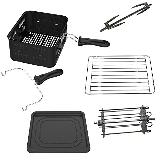 Im Lieferumfang sind verschiedene Zubehörteile enthalten: Drehspieß, Frittierkorb, Schaschlikspieße, Grillrost, Zange.