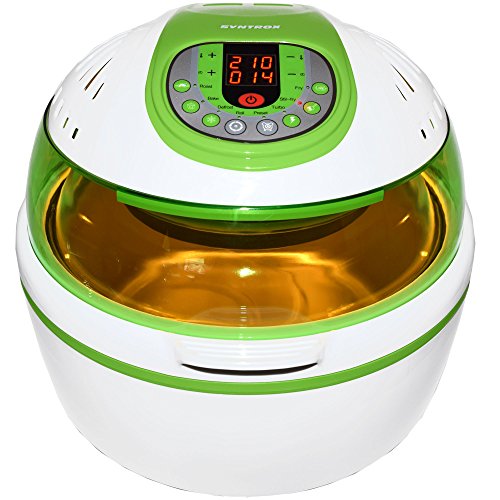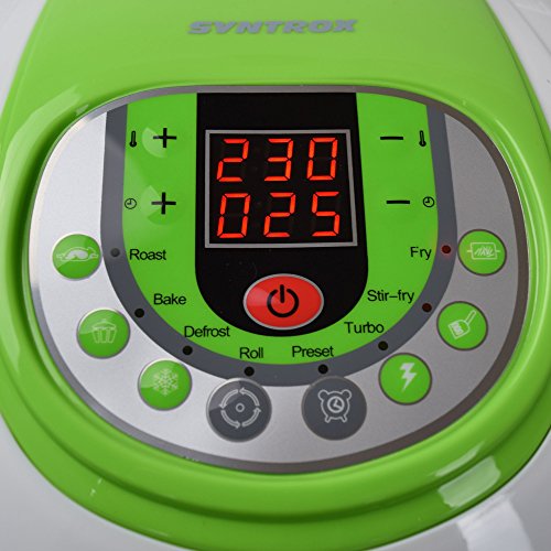 Gewicht: ca. 6kg, 6 Programme: Hähnchen braten, Kuchen backen, Auftauen, Abgasturbolader-Erwärmung, Pizza baken, Frittieren, Power in Watt: 1400W, Fassungvermögen: 10 Liter, Temperatur von 50 bis 230°C, einfache Reinigung, Kabellänge: 1,1 m, Verpackung: 44x44x37cm, Durchmesser: 28 cm, Stromversorgung: 220-240V/50-60Hz, Farbe: grün