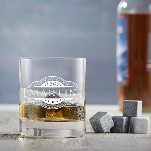 AMAVEL Whiskysteine in Edler Holzbox und Whiskyglas mit Gravur Banderole, Personalisiert mit Namen und Datum,Wiederverwendbare Kühlsteine für Whisky