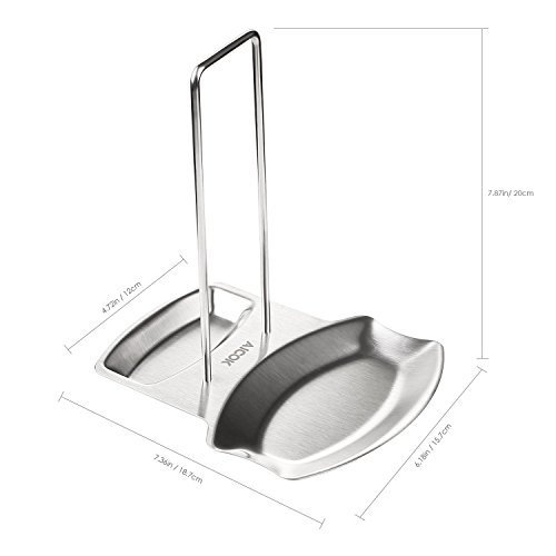 Multifunktional: Die Kochtopfdeckel in verschiedenen Größen können aufrecht platziert werden. Dennoch gibt es noch genügend Platz um einen Kochlöffel daneben abzulegen. Unter der Löffel- / Deckelablage befindet sich ein Teller, in den vom Löffel oder Deckel abtropfende Flüssigkeit gesammelt wird, so dass der Tisch sauber bleibt.