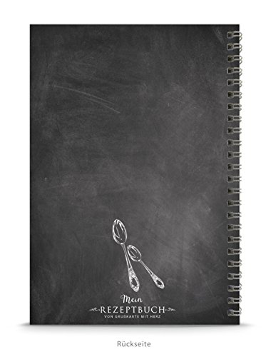 KREATIV DIY KOCHBUCH – “Mein Rezeptbuch” • Rezeptbuch zum Selbstbeschreiben deiner Lieblingsrezepte • in schwarz im “Kreide-Tafel-Retro-Vintage-Look” mit illustriertem Besteck • liniert, mattes Papier, DIN A5 Spiralgebunden, 148,5 x 210 mm • EXTRAS: 1 Transparentpapier Einlage, Lieblingsrezept von Grußkarte mit Herz, Inhaltsverzeichnis, Seitennummerierung, DIY Doppelseite für selbstklebende Aufkleber zum selber ausschneiden & bekleben • ENDLICH ein Rezeptbuch für den Mann der gerne kocht