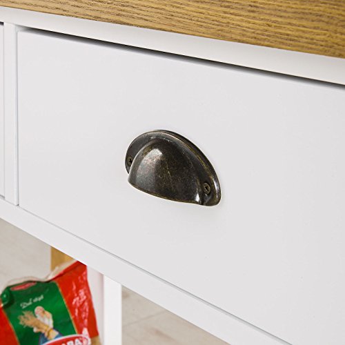 Ausgestattet ist dieser Tisch mit 2 Schubkästen und einer großen Arbeitsfläche sowie eine große Abstellfläche. Zwei leichtgängige Schubladen nehmen es mit jedem Kleinkram auf. Dennoch bietet er optimale Ablageflächen für Geschirr und Melange andere Dinge.