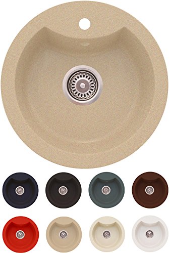 Runde Granitspüle VENGO | Einbauspüle ab 50er Unterschrank | 1-Becken-Küchenspüle | Antibakterielle Beschichtung | incl. kompletter Ab-/Überlaufgarnitur + Drehexcenter + Siebkorbventil
