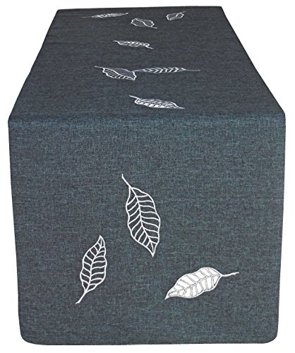 Gestickte Blätter auf pflegeleichter Leinenoptik in anthrazit. Tischband in zwei Größen und Mitteldecke erhältlich. Modernes Design.