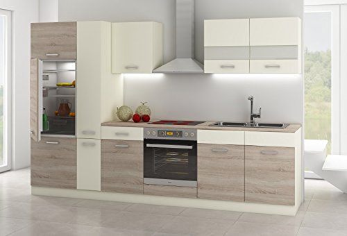 Mit diesem praktischen Küchenblock erhalten Sie eine anspruchsvolle Einbauküche in langlebiger Qualität zum Spitzenpreis. Das raffinierte Design in eleganter Eichenholzoptik macht jede Küche zu einem modernen Ort. Hierbei setzt die schöne Hell-Dunkel-Kombination mit silberfarbenen Griffen und Glaseinsätzen einen ausgefallenen Zungenschlag.