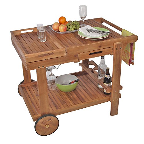 Der Allzweckwagen bietet eine Flaschenablage für Getränke und Weinflaschen, ein praktisches Serviertablett, massenhaft Ablagefläche auf zwei Etagen, eine Halterung für Geschirrhandtücher, einen Schubkasten in dem Sie unter anderem Servietten leistungsfähig verwahren können und ist dank des Holzgriffs und der Räder alias noch unter Dampf stehen
