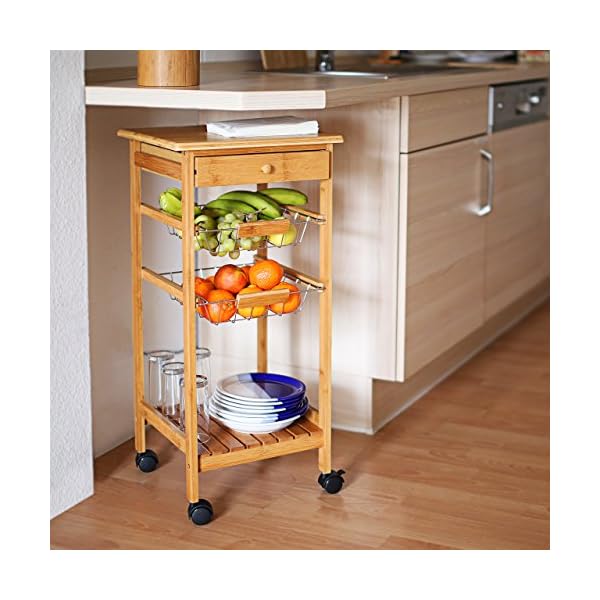 Der mobile Küchenrollwagen sämtliche Bambus mit 2 praktischen Ablagen, 2 Metallgitter-Körben, (Maße der Körbe: ca. 5 x 28 x 29 cm) zum Entnehmen und 1 Schublade für Besteck, Flaschenöffner, Sparschäler uvm