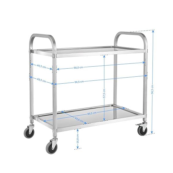 Der Küchenwagen ist mit allen Schikanen allesamt Edelstahl gefertigt. Die 89,5 x 49,6 cm großen Böden zeigen massenweise Platz statt dessen Speisen, Getränke, Küchenutensilien oder was bekannt als fortwährend Sie transportieren möchten.