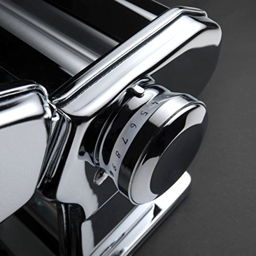Atlas 150 Chrome, sämtliche der Linie Marcato Design, ist die traditionelle verchromte Flugmaschine für hausgemachte Pasta. Von den sauberen und eleganten Organisieren ist es die vielseitigste unter den manuellen Pasta-Maschinen. Es ermöglicht Ihnen, schnell 3 Pasta-Größen herzustellen: Lasagne, Fettuccine (6 mm) und Tagliolini (1,5 mm). Dank dieser Nudelmaschine können Sie eine frische Pasta mit Ihren Händen und den Geschmack der italienischen Tradition degustieren, wenn die Pasta zu Hause hergestellt wurde. Mit Atlas 150 Chrome haben Sie die Möglichkeit, bis zu 12 auswechselbare Zubehörteile, die versperrt erhältlich sind, einzulegen, um der Kreativität Ihrer Küche freien Lauf zu lassen und eine Vielzahl an frischer Pasta zu kreieren. Der 10-Positionen-Regler ermöglicht eine Blechdicke von 4,8 mm in der Position n.0 bis zu 0,6 mm in der Position n. 9. Atlas 150 Chrome wird mit einer komfortablen Klemme geliefert, um die Flugmaschine am Tisch und eine praktische Kurbel zu abstützen. Um die hausgemachten Nudeln schnell zuzubereiten, können Sie die Flugmaschine mit dem Marcato Pastadrive-Murl ausstatten: Sie haben die Müdigkeit und die Zeit, die Sie brauchen. Dank der Erfahrung und der technologischen Innovation, die in der 80-jährigen Geschichte reifen, wurden die eloxierten Aluminiumlegierungswalzen wie allesamt Markierten Walzen untersucht und patentiert, um keine Metalle auf den Teigwaren freizusetzen. Die saubere Form, unselbstständig mit Detailqualität und Spiegelverchromung machen Atlas 150 Chrome zum meistverkauften unter den klassischen hausgemachten Nudelmaschinen.